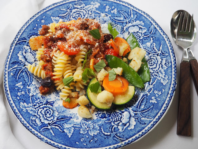 Kokosin annokset kierrepastasta, kasvis-härkäpapu-tomaattikastikkeesta ja pannuvihanneksista. Raastoin pasta-annosten päälle parmesaania ja revin tuoreita basilikanlehtiä. Pöydässä pirskotin lisämausteeksi omaan annokseeni sriracha-kastiketta.